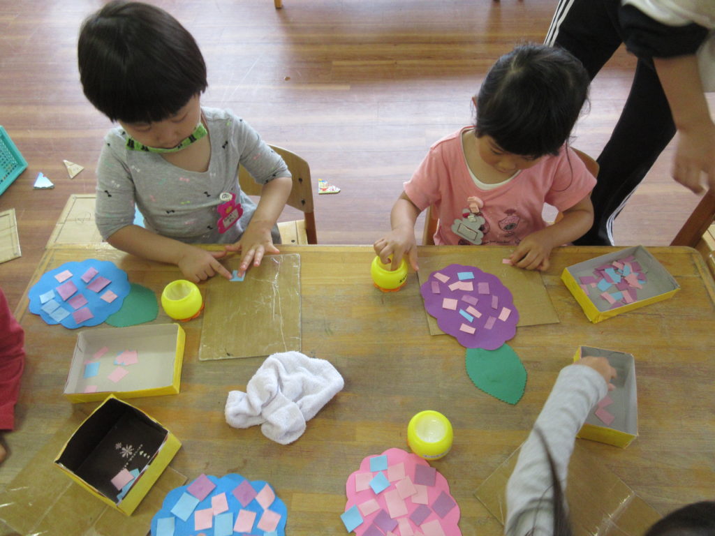 自分の好きな色を切って、思い思いに貼って、自分だけの素敵なアジサイが完成しました![]()
