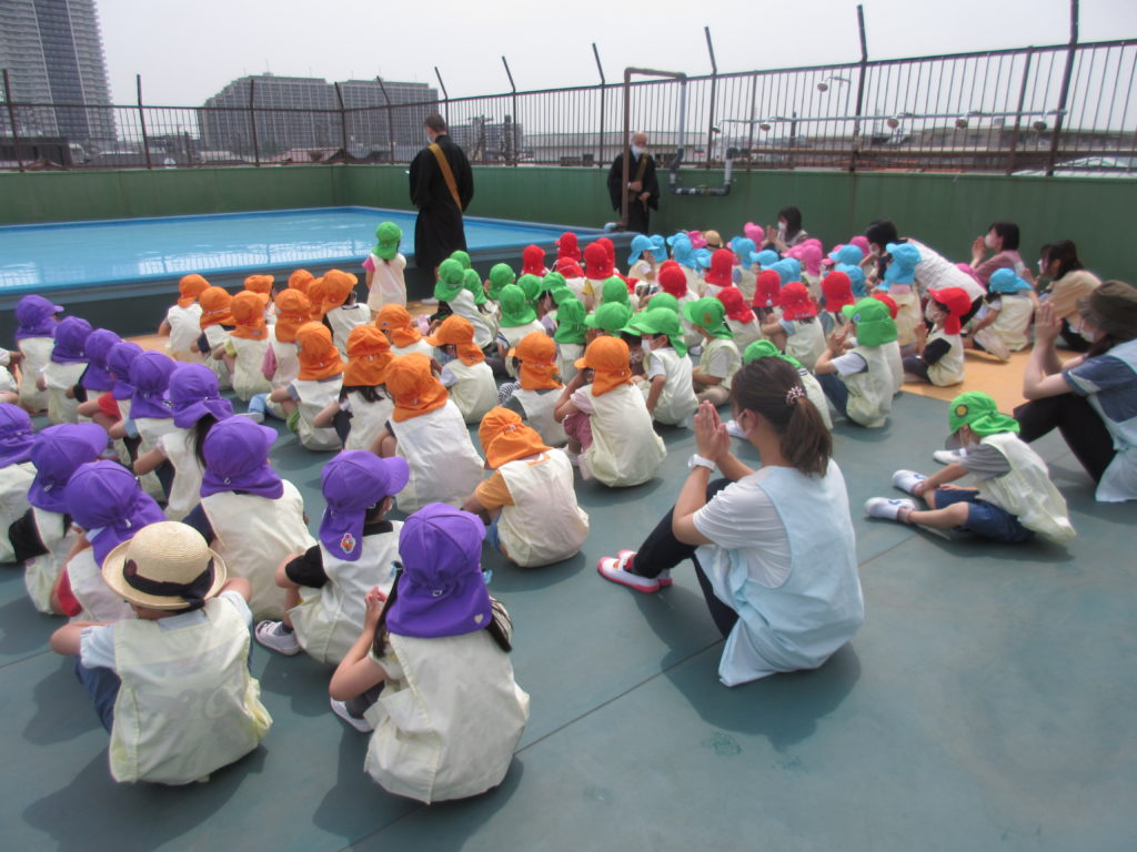 お祈りの後に、園長先生から塩やお酒を入れる意味、プールでの約束などのお話を聞きました![]()