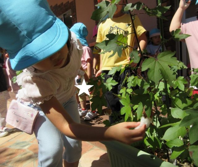 4月に植えた綿花ですが、夏休みの間にきれいな黄色い花を咲かせ花が咲いた後に真っ白い綿ができました
