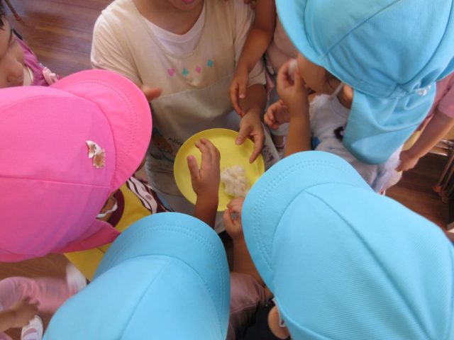 ふわふわの綿にみんな興味津々