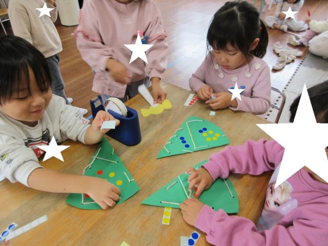 大人はジグザグになるように通していく事が多いですが、子どもたちは思い思いの穴に通していくのでいろいろなデザインになります![]()