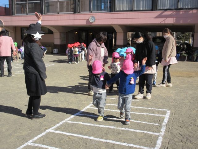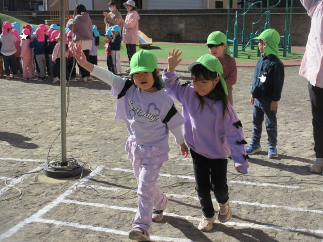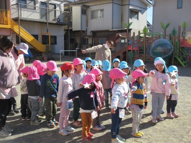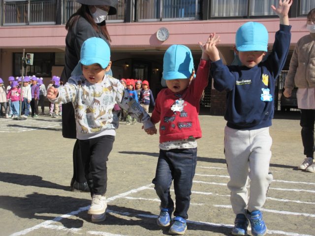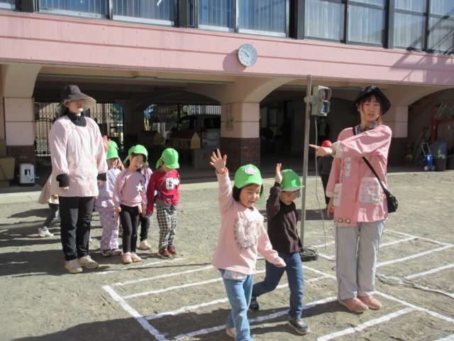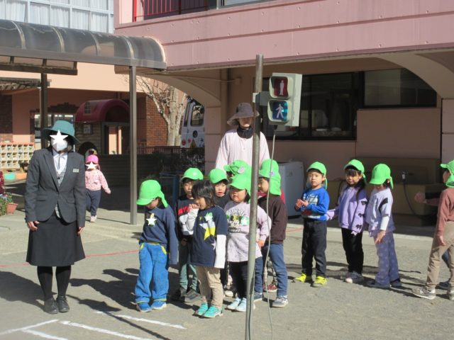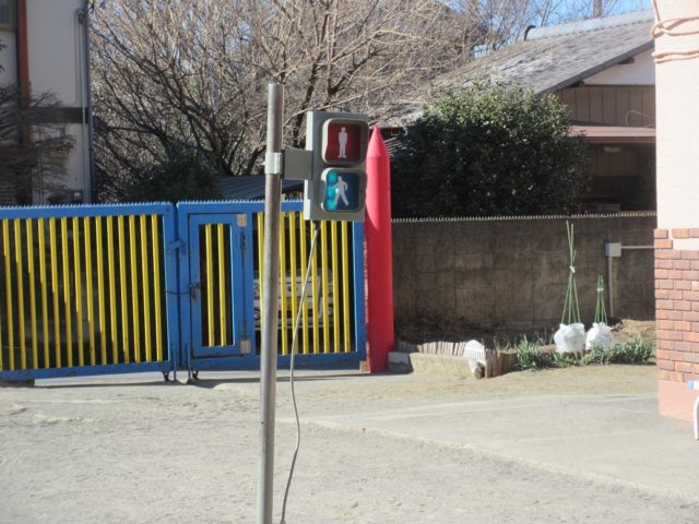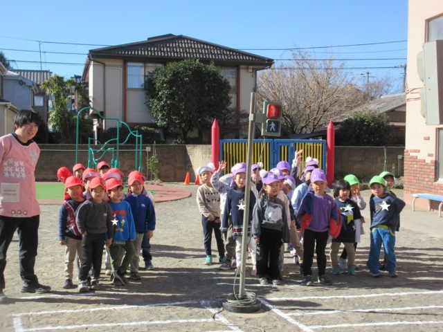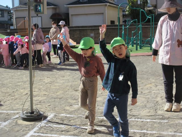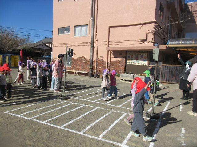 その後、実際に横断歩道を渡る練習を園庭で行いました
