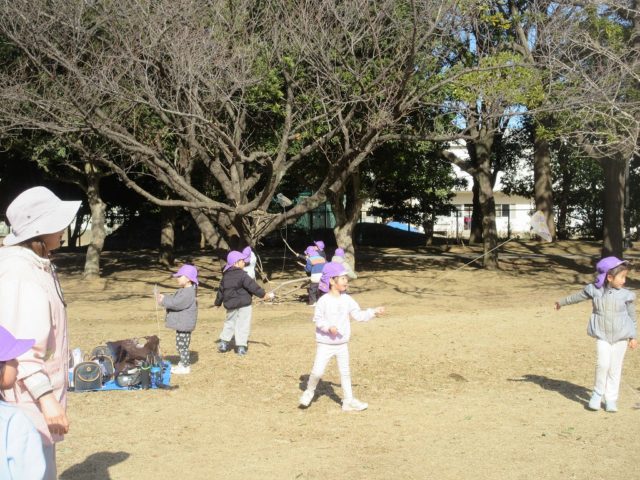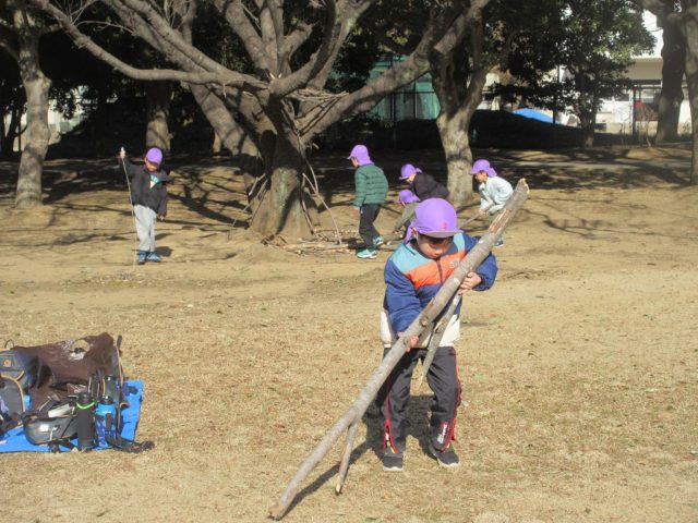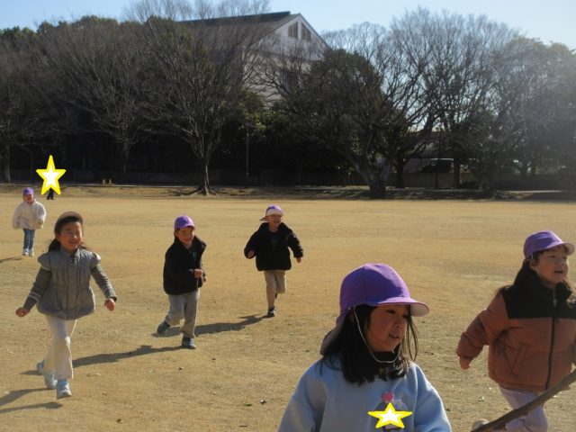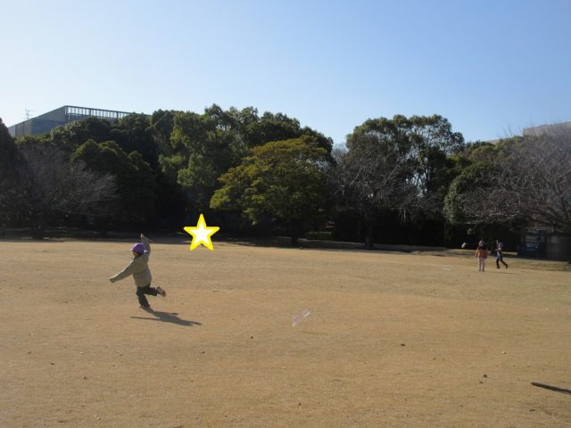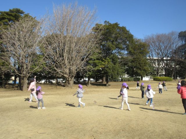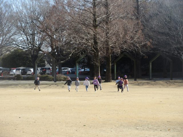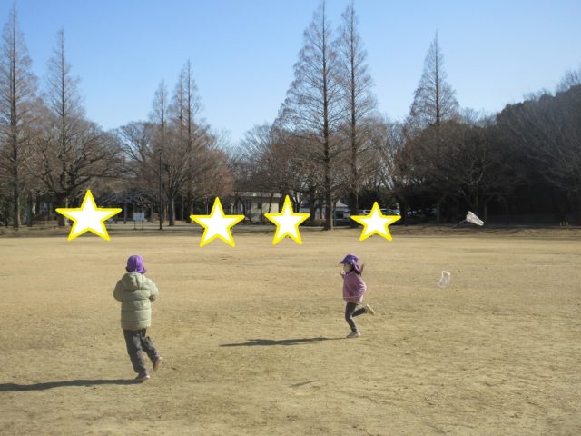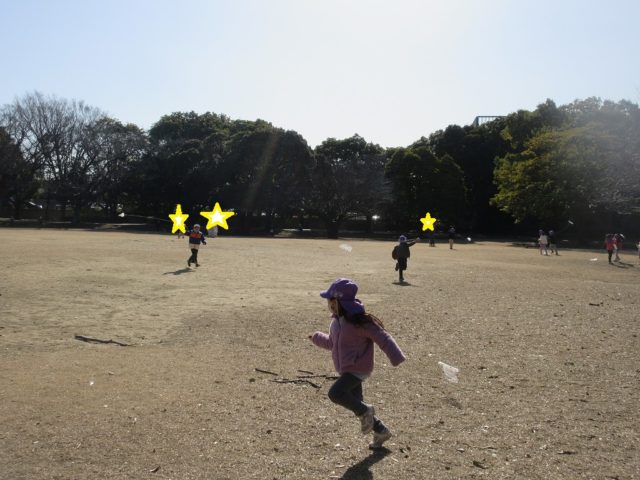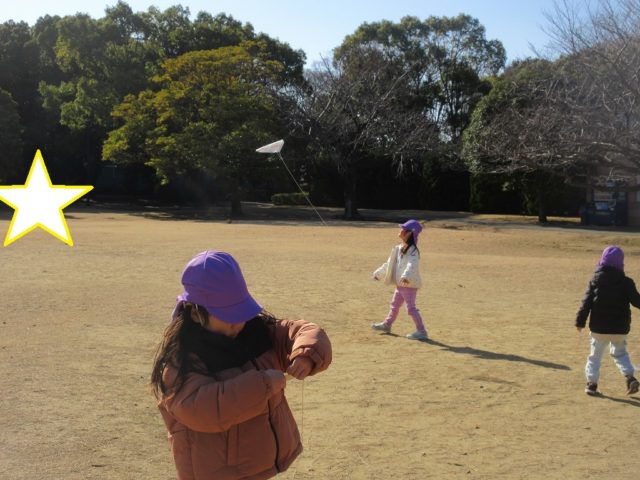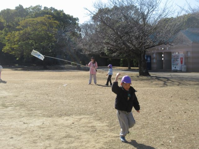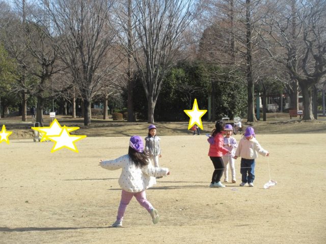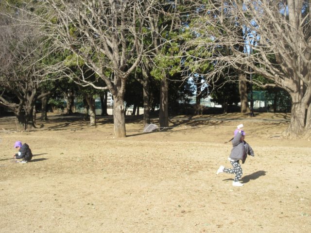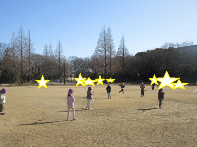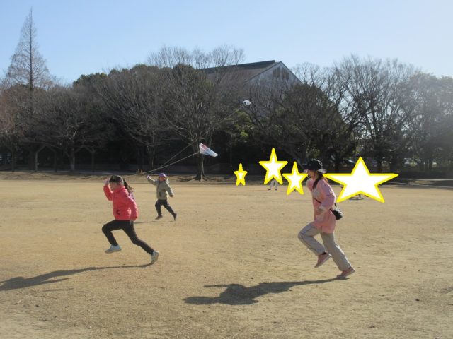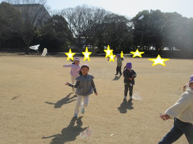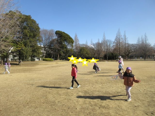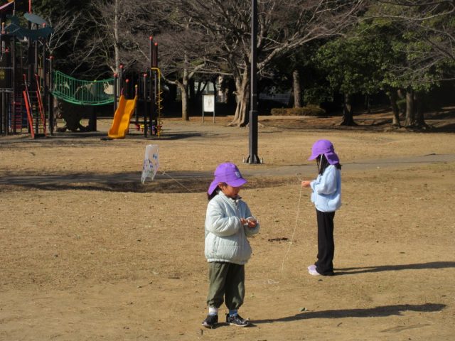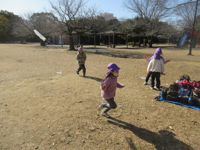 幼稚園で作ってからも、タイミングを見つけて園庭でたこあげをしていた子どもたち![]()