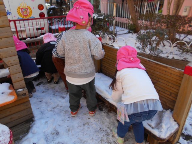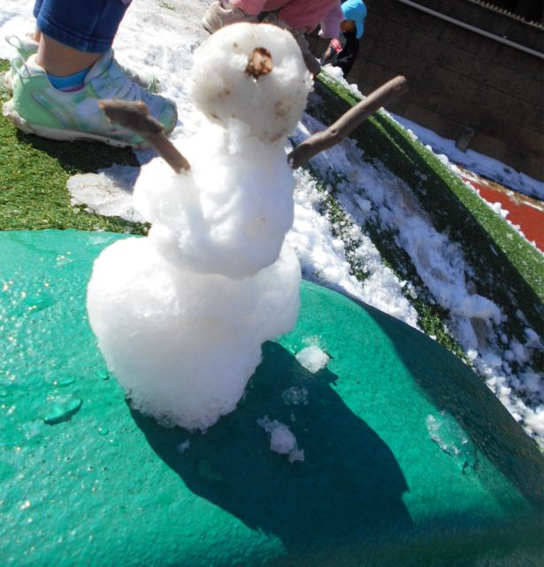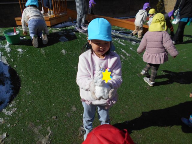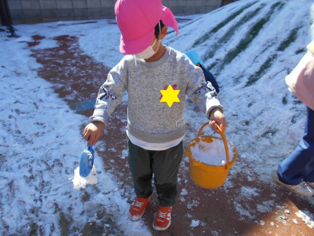 「寒い~~」と言いながらもバケツに雪を入れたり、雪だるまを作ったりと元気よく遊んでいましたよ!!