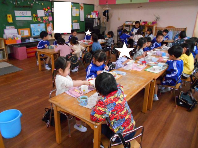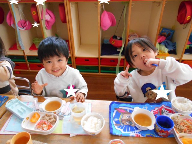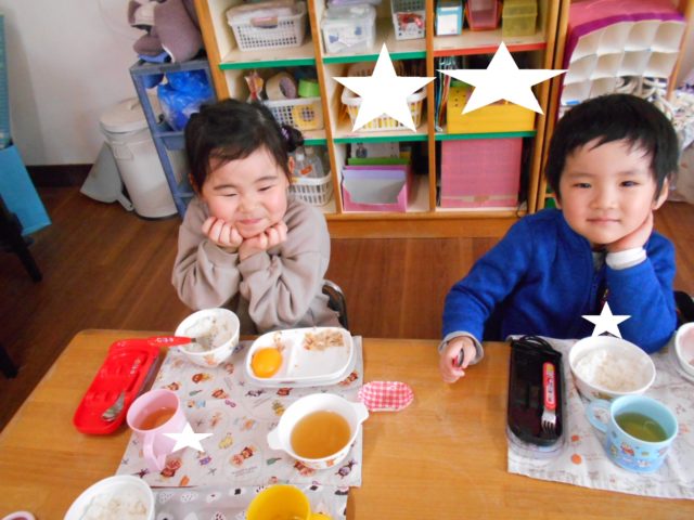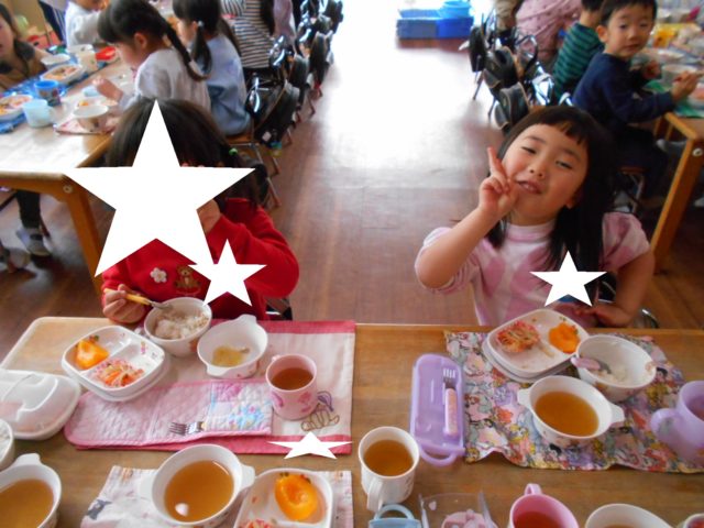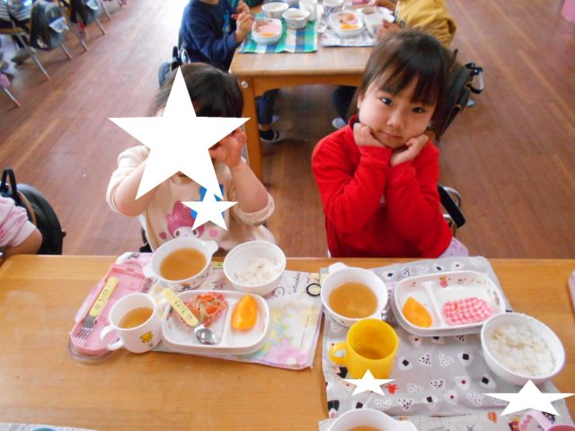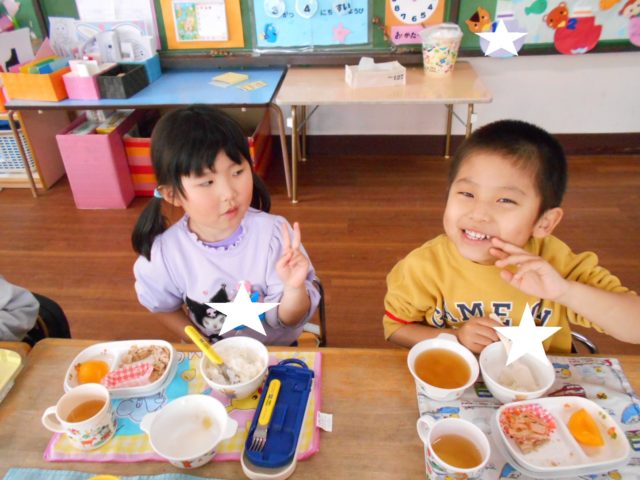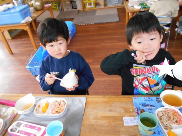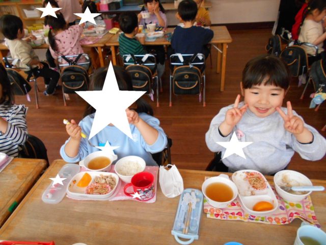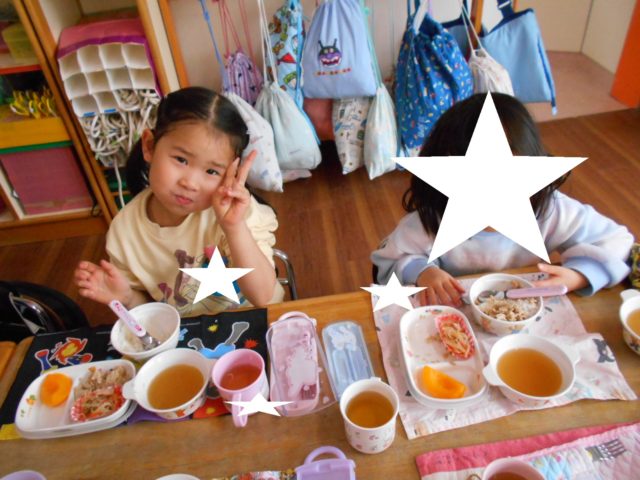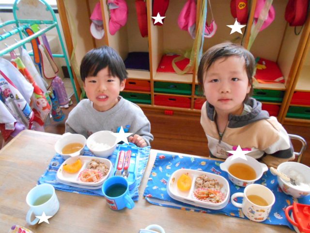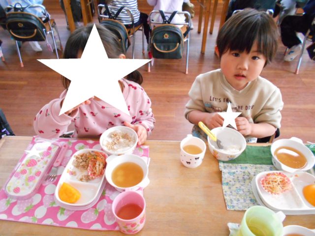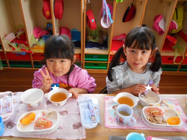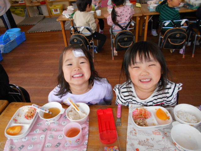 いつも一緒に食べている子ではなくて、違うクラスのお友だちと一緒に食べることにしました☆