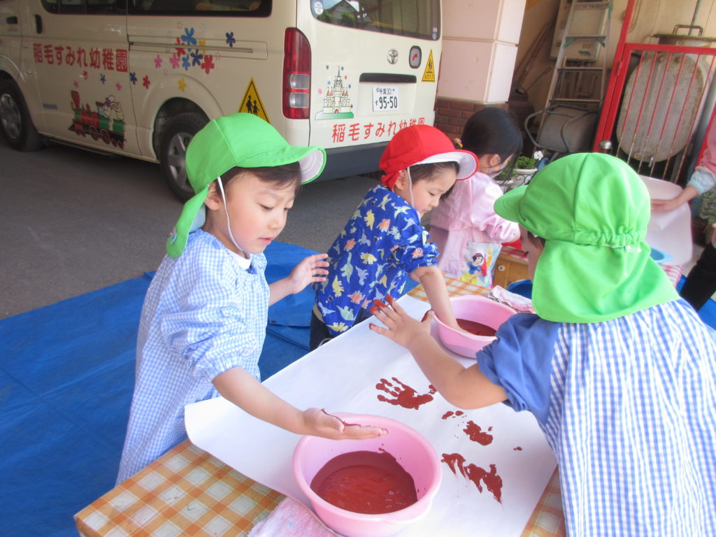 お天気も良かったので、園庭で絵の具を使っての製作![]()
